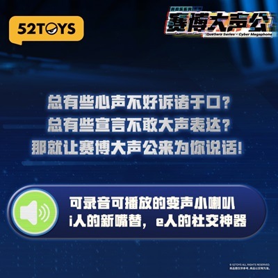 52TOYS BLINDBOXシリーズより、オリジナルトレーディングフィギュア『サイバーメガホン』が登場!実際に声を録音してメガホンから再生できるギミック仕様!ラインナップは全4種+シークレット1種